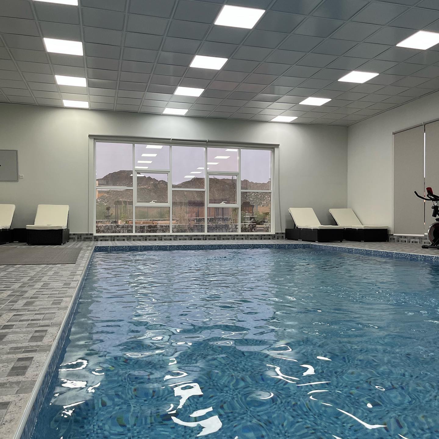 Indoors, the well-equipped kitchen caters to culinary needs, while the dual living rooms offer ample space, one of them providing direct views of the indoor swimming pool and gym. A standout feature is the captivating experience of swimming with panoramic views of the mountainsides.