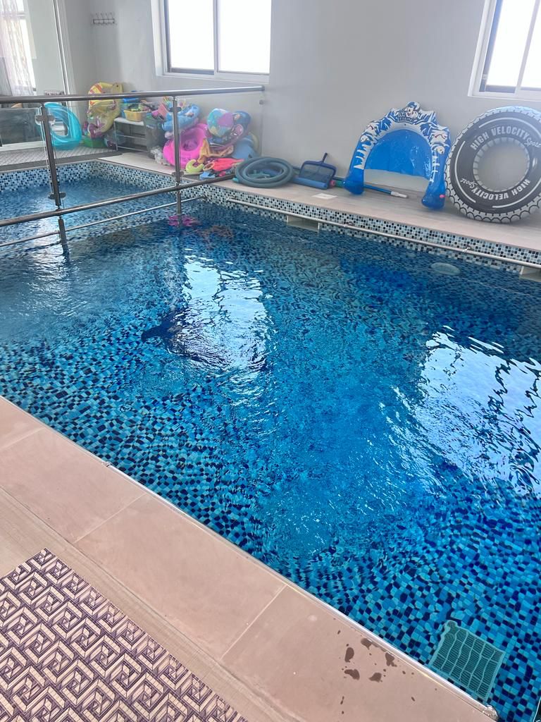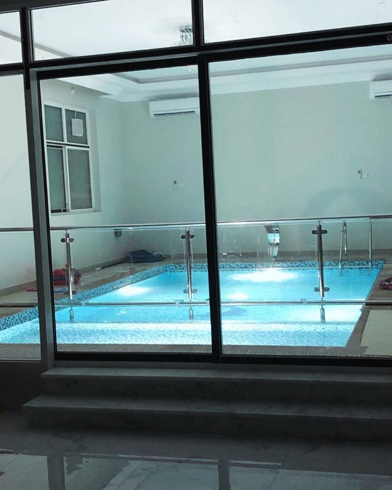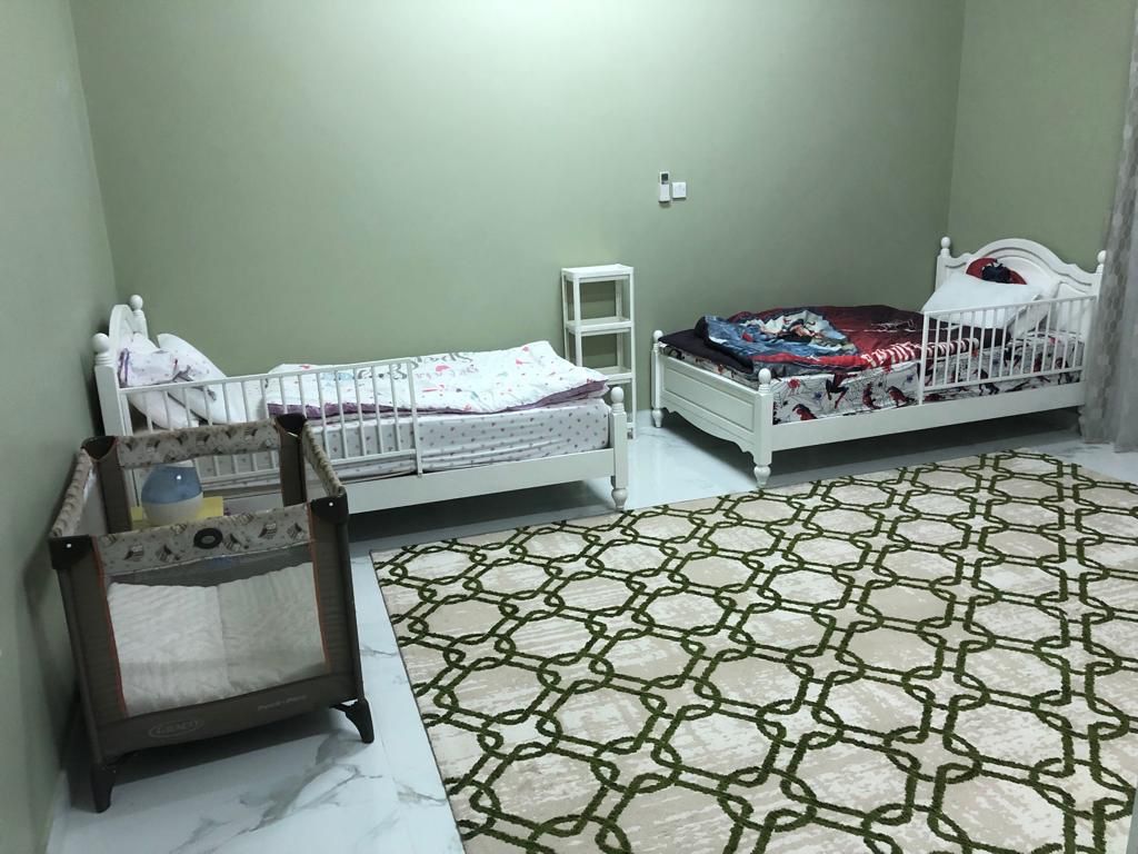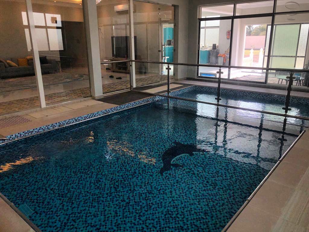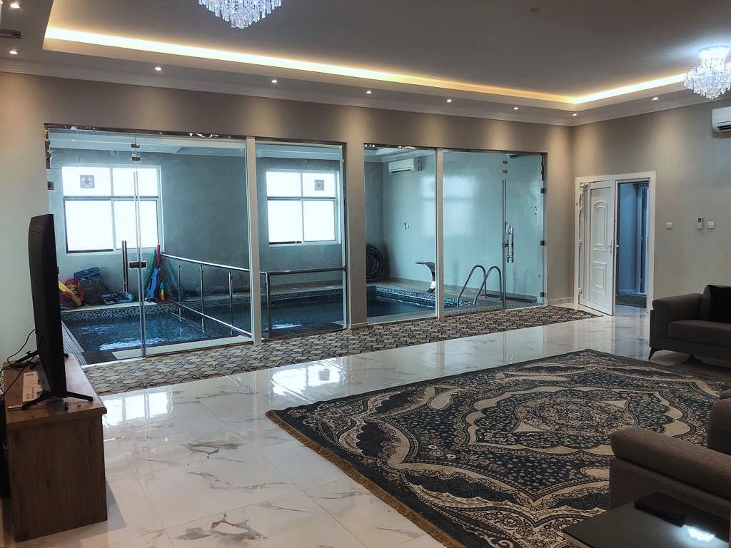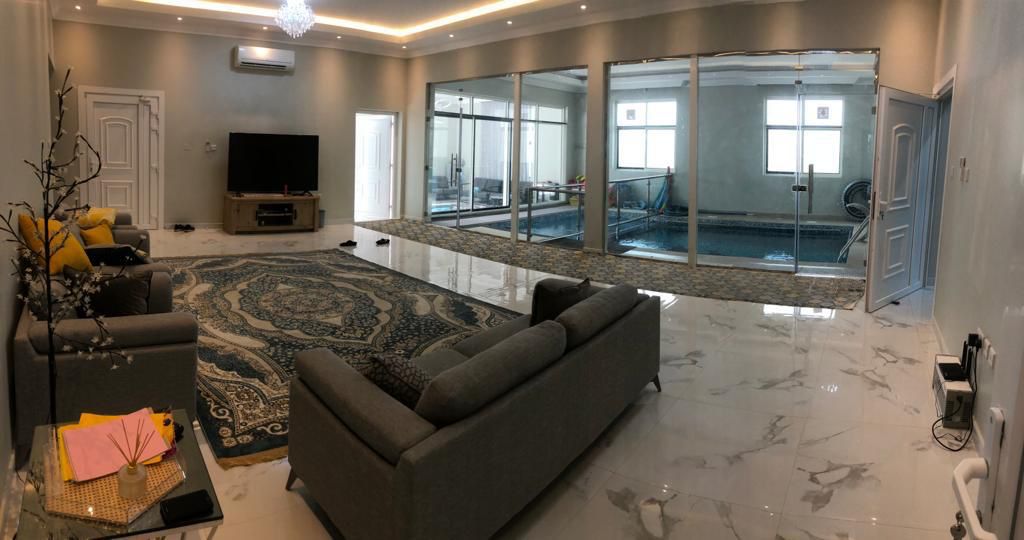 Tal Alroudha is a four-bedroom farm located in Remah Al Ain, featuring dedicated children's rooms. The living room provides direct views of the indoor pool, which is divided into two separate sections—one for adults and another for kids.